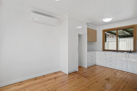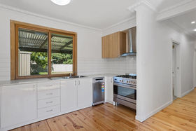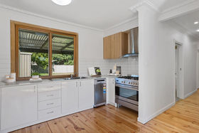 The kitchen is equipped with a 900mm freestanding stainless-steel stove, dishwasher and overhead cabinetry, overlooking the lush backyard. The home also includes a spacious lounge, a three-piece bathroom, separate toilet and laundry, along with split system heating and cooling and downlights for year-round comfort.