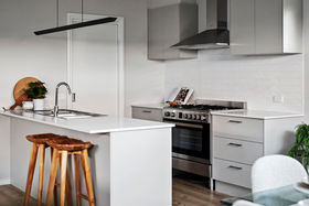Contemporary kitchen with gas cooking and plenty of storage with a butlers pantry.