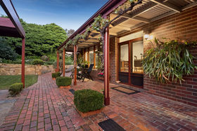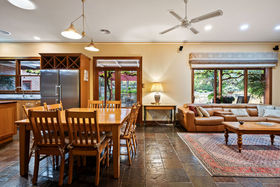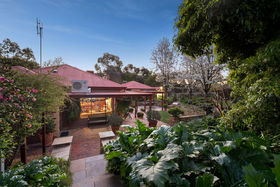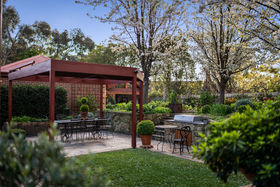 At the heart of the home is an open-style kitchen, meals, & family area perfect for entertaining. The gourmet kitchen impresses with an Italian 900mm Smeg stove, jarrah-topped island, Vic Ash cabinetry, & Miele dishwasher. North-facing windows in the meals/family area provide lovely views of the beautifully landscaped rear garden featuring terraced stone walls, meandering paths, & a conversation pit. Enjoy the tranquility of deciduous trees & raised vegetable beds, along with a quaint studio offering a creative space or a cosy retreat. A vine-draped verandah & open pergola facilitate year-round alfresco dining & entertaining, making this home an inviting oasis.