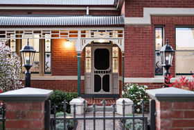 Set behind a brick and iron fleur-de-lis-topped fence, the original front facade features tuck-pointed red brickwork a timber fretwork frieze to the return front veranda and tessellated tiles underfoot.