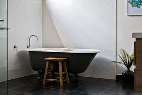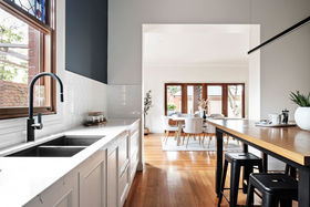 The extension encompasses the main bathroom, a separate WC, the storage-rich laundry, a large kitchen, a dining/family area and timber stairs to the second level where you will find three large bedrooms (BIRs), a WC, a luxe bathroom with claw foot bath, in situ shower and twin vanity basins, and a sitting room with a balcony and views to the nearby Cathedral spire.