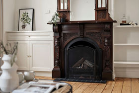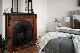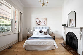 The layout features a central arched hallway leading to two generously sized bedrooms. Each with a restored open fireplace, timber surround and mantlepiece. The main bedroom includes a walk-in robe/dressing room and an ensuite highlighting a stone-topped vanity with twin hand basins, a