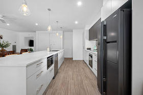 A short step up from the front zone leads to the expansive open-plan kitchen, dining, and second living area, where everyday comfort meets contemporary design. The beautifully appointed kitchen features plentiful storage, induction cooktop, electric oven, dishwasher, and a large island bench that provides plenty of space for meal preparation and entertaining.